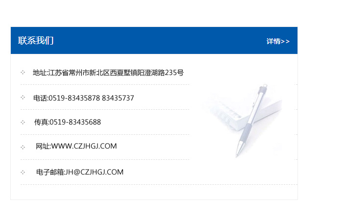 地址:常州市新北區友邦商務大廈1幢16、17層  電話:0519-85101652  傳真:0519-85112595  郵編:213022  網址:www_cz-jiayue_cn.bjhwtl.com  郵箱:xiajifengaa@163.com
